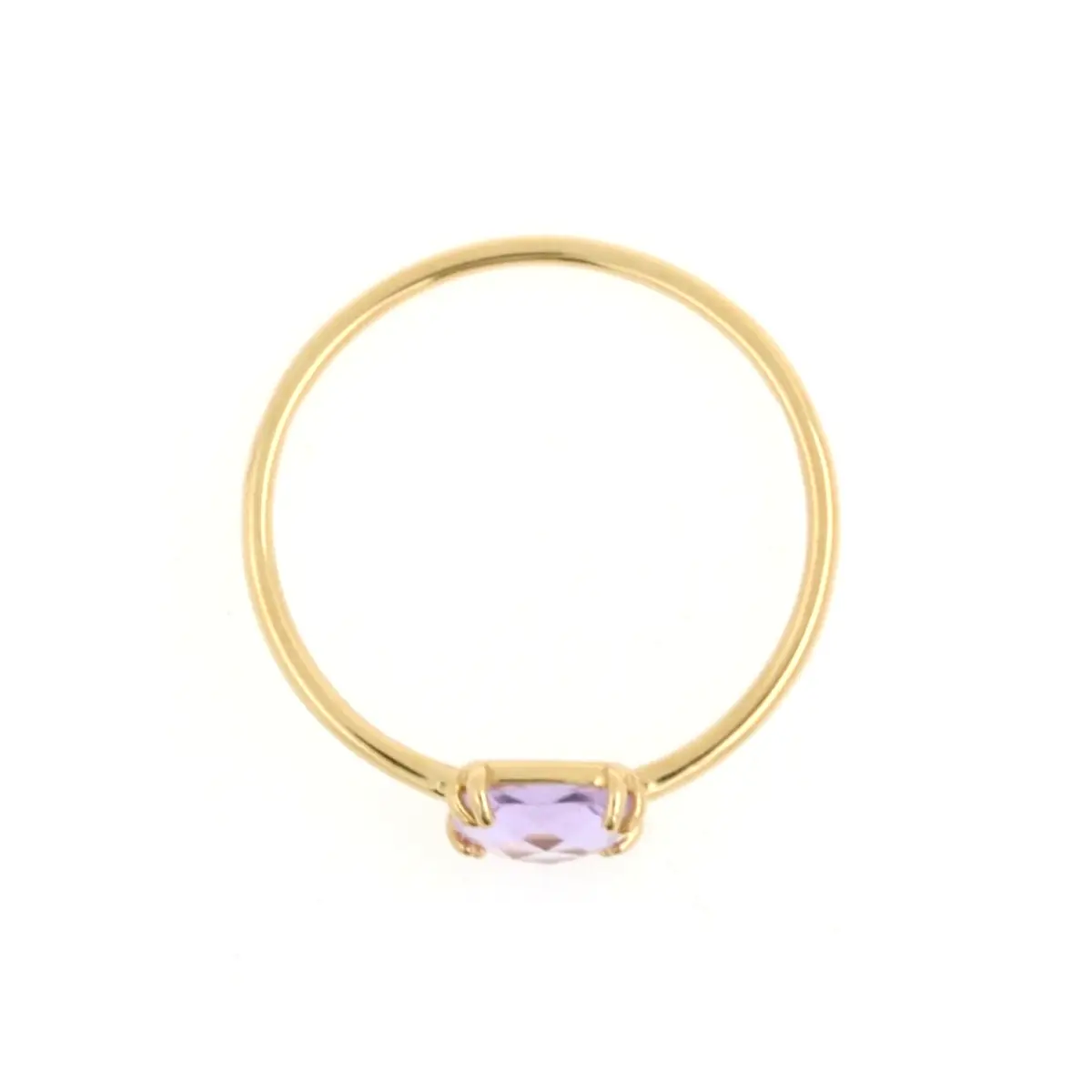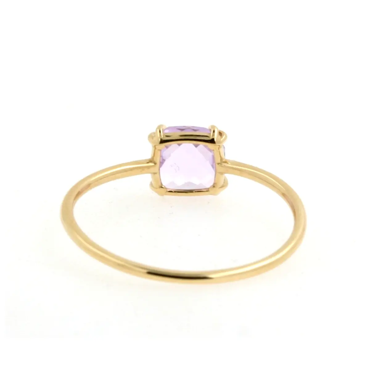 Un punto di colore elegante e luminoso: anello in oro giallo 18 kt con cristallo viola dal taglio cushion, montato su una montatura minimal a quattro griffe che ne lascia passare tutta la luce. Perfetto da solo o mixato con altri anelli sottili.