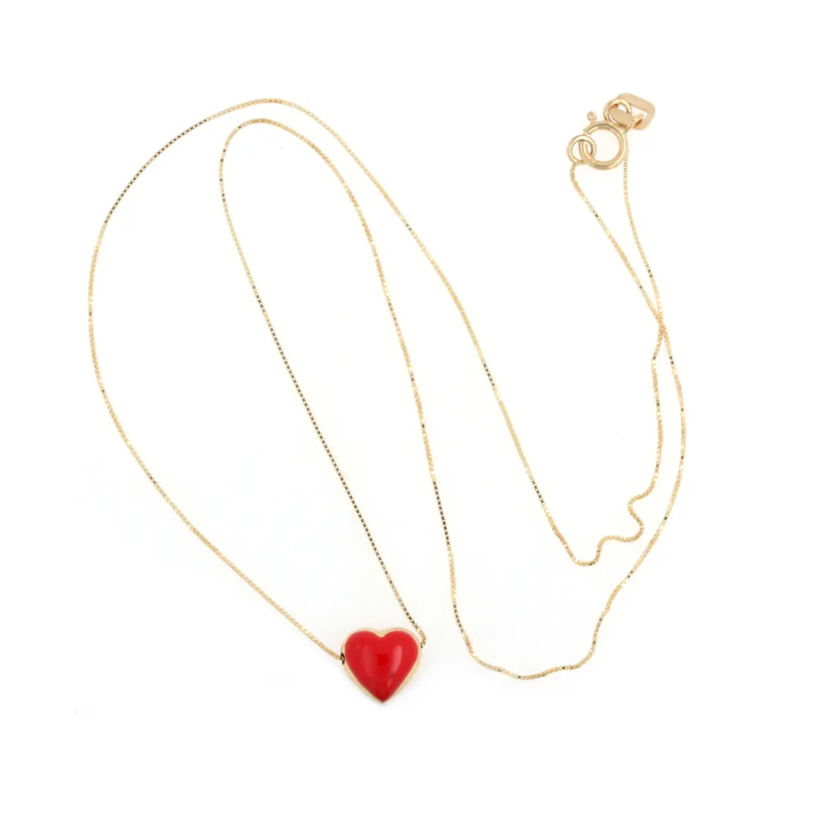 Un tocco di colore che illumina ogni look: collana in oro giallo 18 kt con cuore bombato smaltato rosso, essenziale e romantica. Il ciondolo scorre su una catenina fine per una luce elegante e quotidiana.