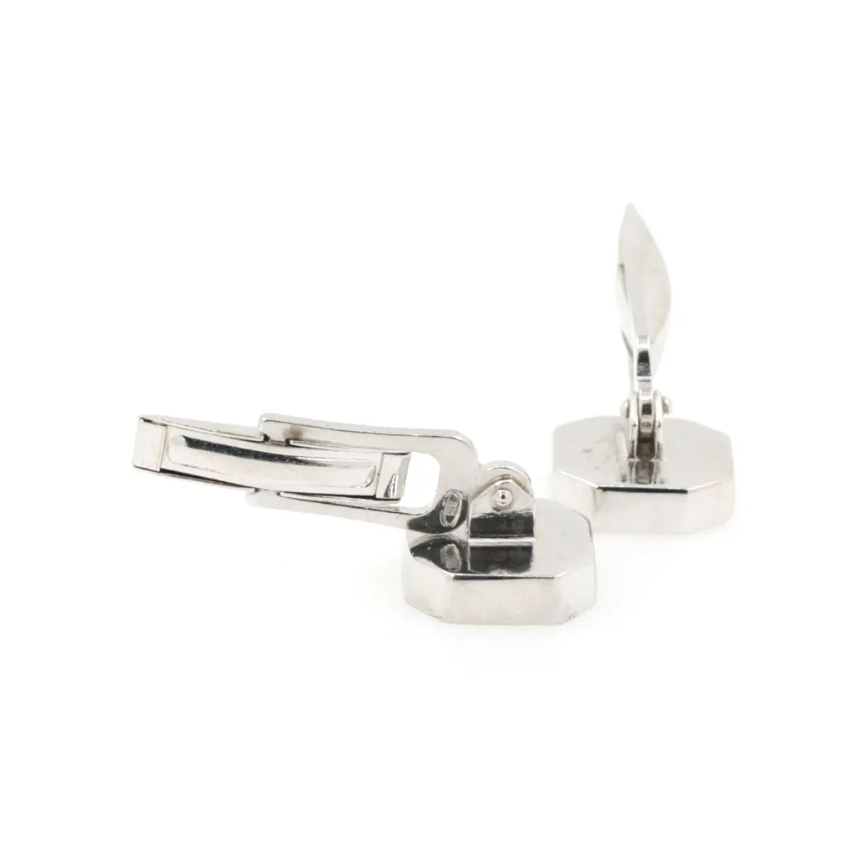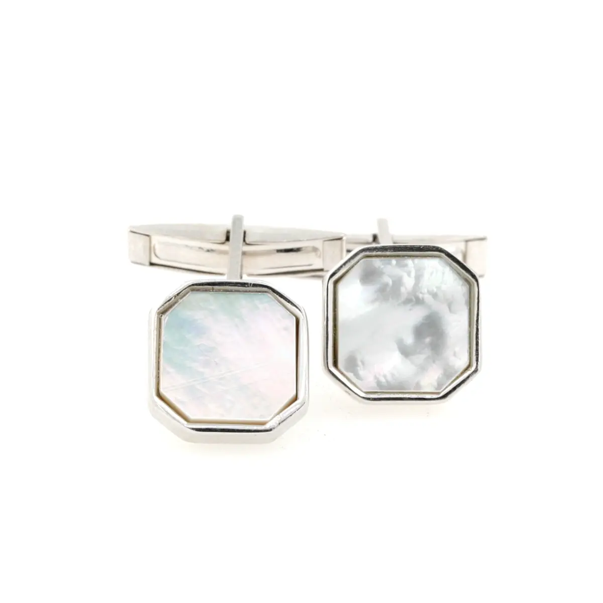 Raffinati ed essenziali, questi gemelli presentano una montatura ottagonale in argento 925 rodiato che esalta il riflesso cangiante della madreperla naturale. Il formato compatto, circa 13 mm di lato, li rende eleganti ma discreti, perfetti per camicie a polso doppio e outfit formali.
